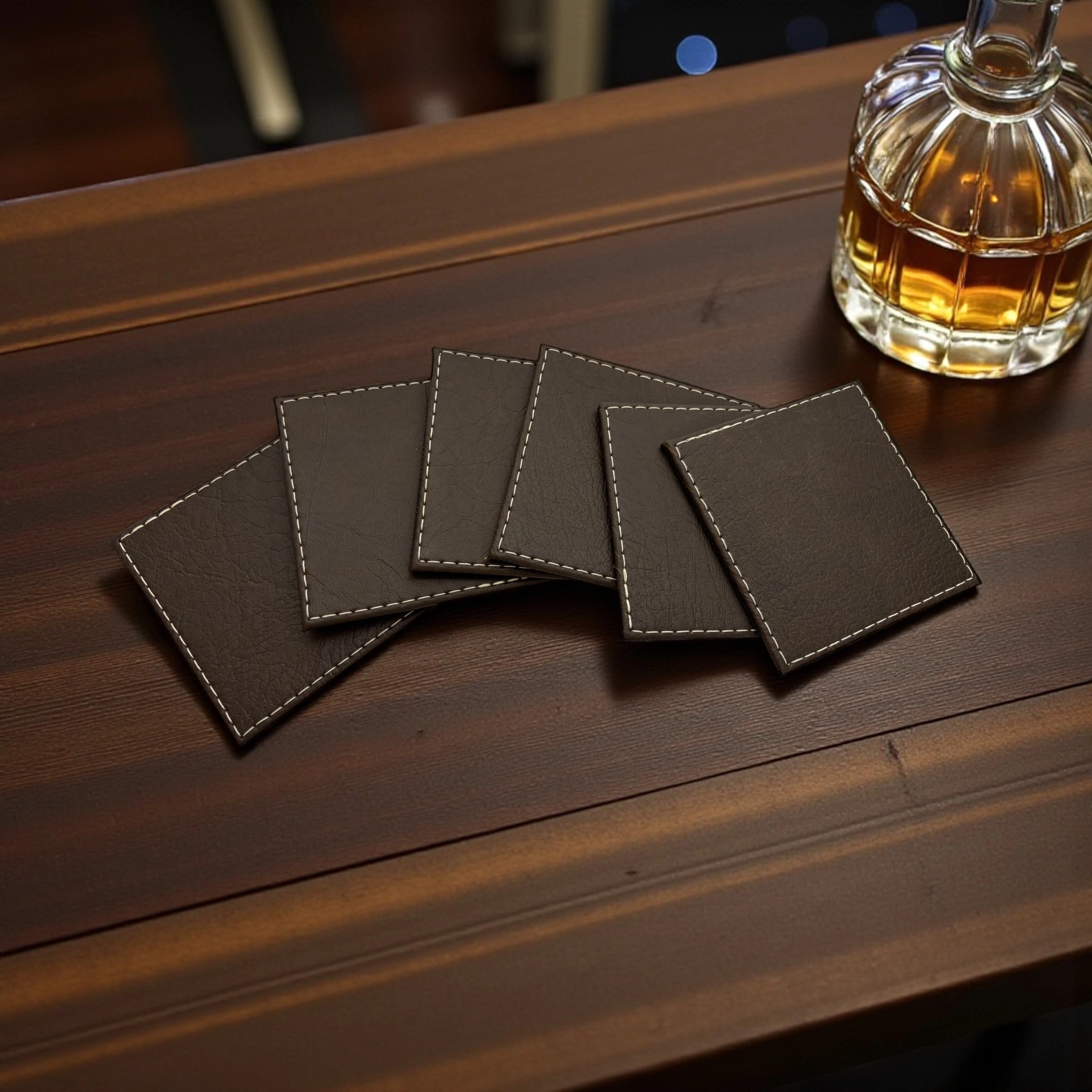 Set de portavasos confeccionados en cuero, con costuras visibles y terminación sobria. Protegen superficies del calor y la humedad, aportando un toque cálido y elegante a la mesa. Ideales para uso diario o como regalo atemporal.